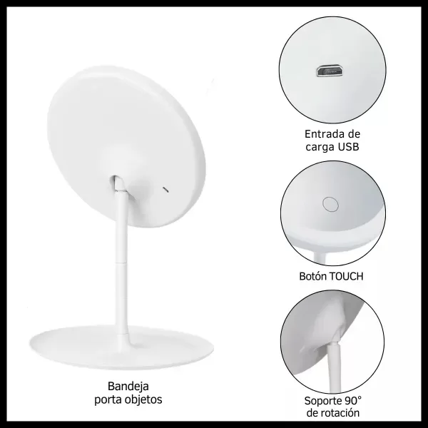 ESPEJO TOUCH CON LUZ LED DE TOCADOR FUNCIONA A BATERÍA RECARGABLE CON CABLE USB INCLUIDO 3 INTENSIDADES DE LUZ